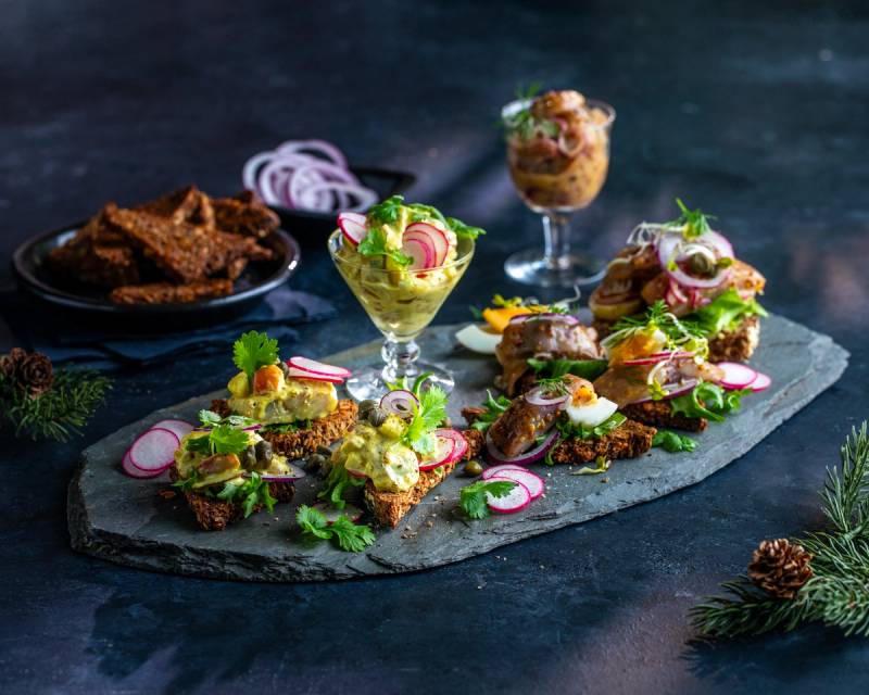 - Smørbrød: Legg sild på grovt brød med rødbet- eller eplekompott, topp med rømme og urter.