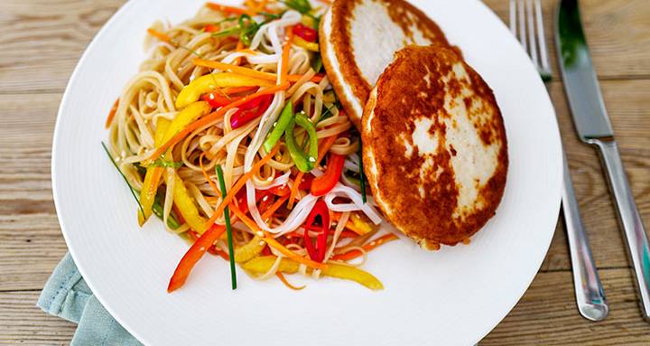 Fiskeburgere trenger ikke serveres som en burger – prøv med denne asiatiske nudelsalaten neste gang du vil ha noe kjapt, godt og fargerikt til lunsj eller middag.