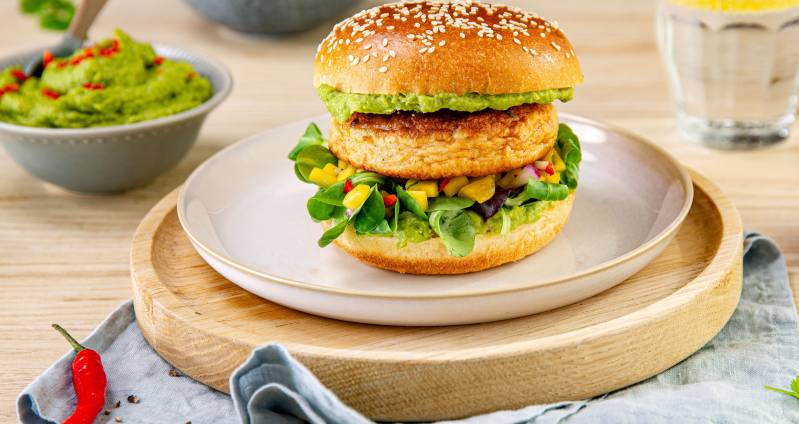 7. Bygg opp burgeren med guacamole i bunnen av brødet, deretter salat, mangosalsa, fiskeburger og et nytt lag guacamole på toppen.