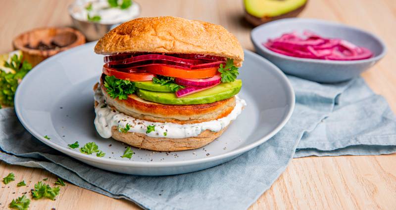 Vil du ha en sunnere vri på den tradisjonelle burgeren? Bruk fiskeburger med 80% fisk og grovt burgerbrød. Med hurtigsyltet rødløk, avokado, tomat og urtedressing har du en rask, næringsrik og ikke minst smakfull middag du kan nyte til hverdags.