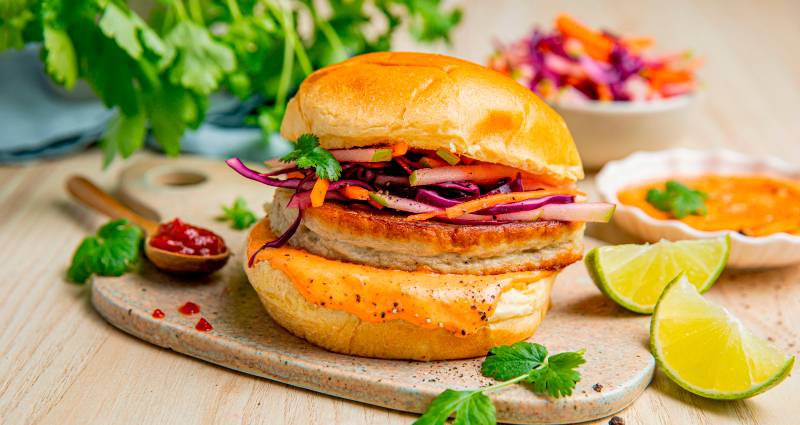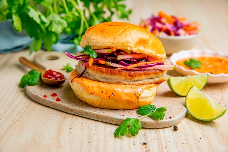 Fiskeburger av torsk og hyse er mild på smak og kler derfor smaksrikt tilbehør inspirert av det thailandske kjøkken. Med knasende sprø råkostsalat av gulrot, grønt eple og rødkål og en spicy chilimajones får du en frisk og fristende fiskeburger.