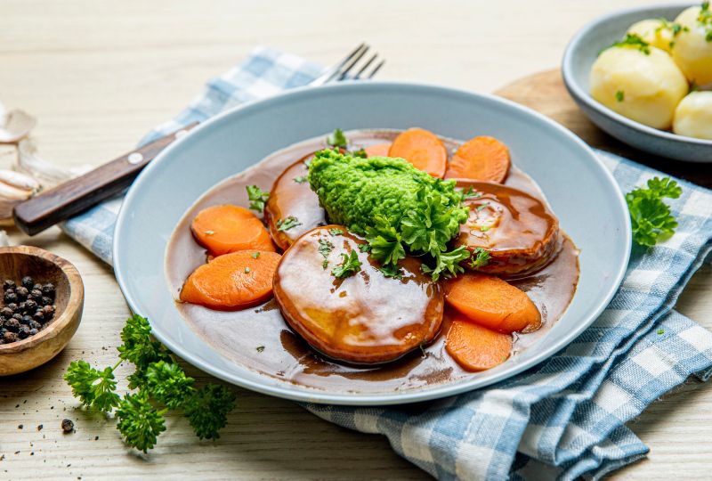 - Lag ertepure ved å gi ertene et oppkok, helle av kokevannet og kjøre ertene til en jevn pure med smør, salt og pepper.