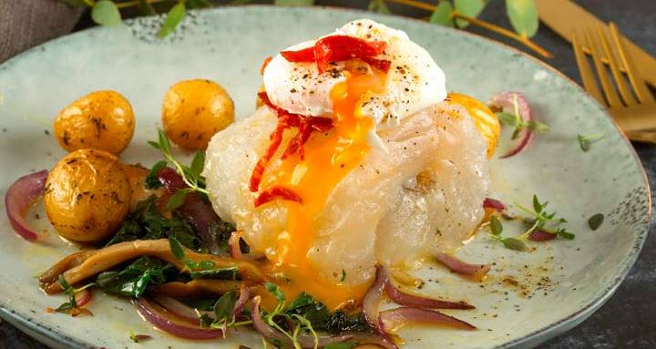 Ovnsbakt lutefisk med chorizosmør og posjert egg