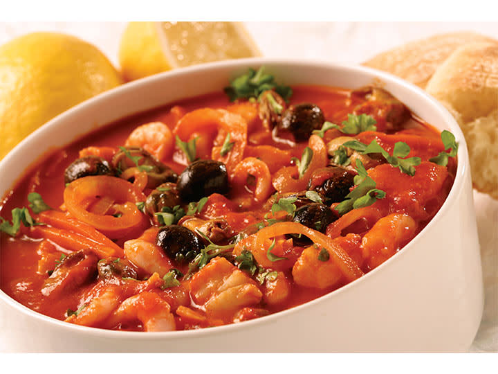 Varm 2 ss olivenolje i en kjele. Fres løk, hvitløk og gulrøtter i ca 5 minutter, eller til de er møre. Tilsett tomater, tomatpurè, oliven og laurbærblad. Krydre med salt og pepper. La det småkoke i 15 minutter. Spe med vann hvis gryten tykner for mye. Varm opp resten av olivenoljen i en panne og stek baguettskivene på begge sider. Legg så skivene over på kjøkkenpapir som trekker til seg overflødig olje. Tilsett fisken i tomatsausen og småkok i 5 minutter. Ha i skalldyrene. Fjern laurbærbladet. Legg baguettskivene i bunnen av 4 dype tallerkner og posjonér fiskegryten. Pynt med hakket persille.