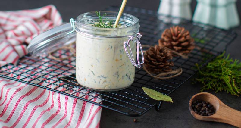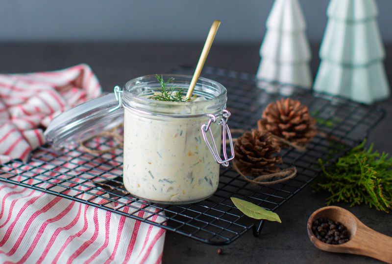 2. Bland sammen alle ingrediensene unntatt sild og egg. Smak eventuelt til med litt salt, pepper og sukker hvis du ønsker det.