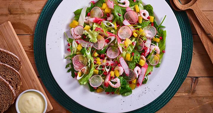 Bland sammen granateple, mango og reddiker i bollen. Ringle over litt olivenolje og smak til med salt og pepper.
