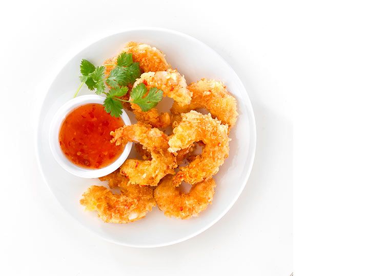 Ha hvetemel med en klype salt og pepper i en skål, visp sammen eggene i en annen skål og ha panko/brødkrummen i en tredje skål. Dypp rekene først i hvetemel, så i egg og til slutt i panko/brødkrummen. Pass på at rekene blir dekket skikkelig i alle steg. Varm opp 3 dl olje i en kasserolle. Når det bobler rundt en trespisepinne er oljen klar til fritering. Rekene friteres i et par minutter, til de er fine og gylne. Server med Sweet Chili-saus.