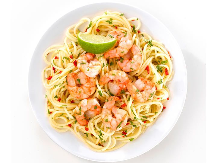 Kok spaghettien som beskrevet på pakken. Skyll den i kaldt vann når den er ferdig kokt. Stek finhakket hvitløk og chili i olje i en stekepanne, ha i rekene og stek i noen minutter på begge sider. Ha i spaghettien og bland alt. Dryss over hakket basilikum og koriander. Kryst over ønsket mengde lime.