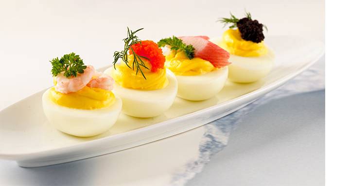 Del hardkokte egg i to. Ta ut plommen og bland den med majones. Legg blandingen tilbake i egget, med en liten klatt lodderogn og dill, pillede reker og persille eller. Her er det bare fantasien som setter grenser.
