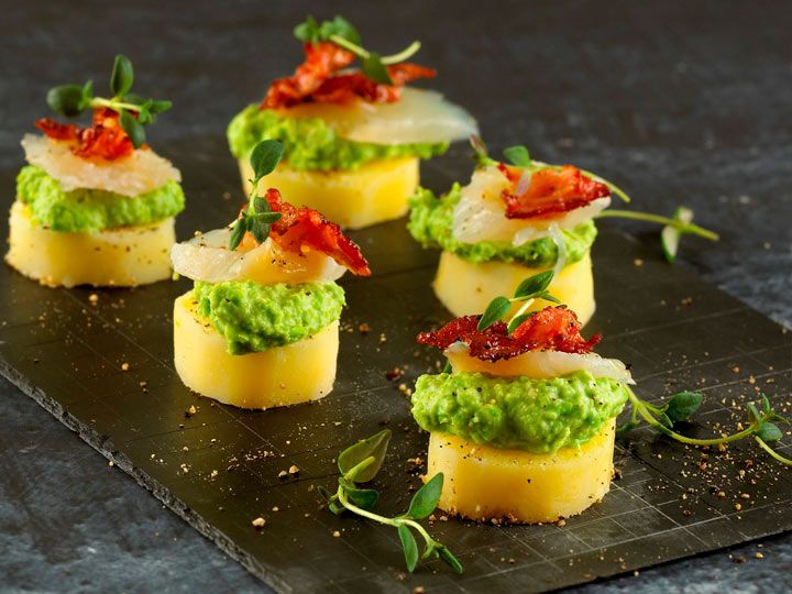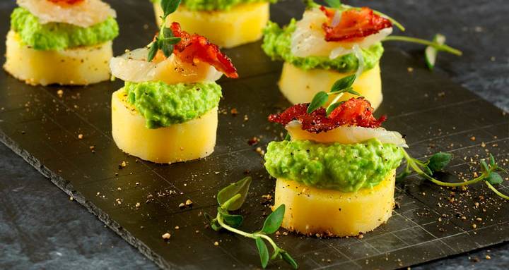 Del poteter i tynne skiver, dryss over litt salt og kvernet sort pepper. Legg over lun (eller kald) ertepuré, kald lutefisk og topp med sprøstekt varmt bacon. Pynt gjerne med frisk timian.