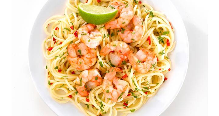 Kok spaghettien som beskrevet på pakken. Skyll den i kaldt vann når den er ferdig kokt. Stek finhakket hvitløk og chili i olje i en stekepanne, ha i rekene og stek i noen minutter på begge sider. Ha i spaghettien og bland alt. Dryss over hakket basilikum og koriander. Kryst over ønsket mengde lime.
