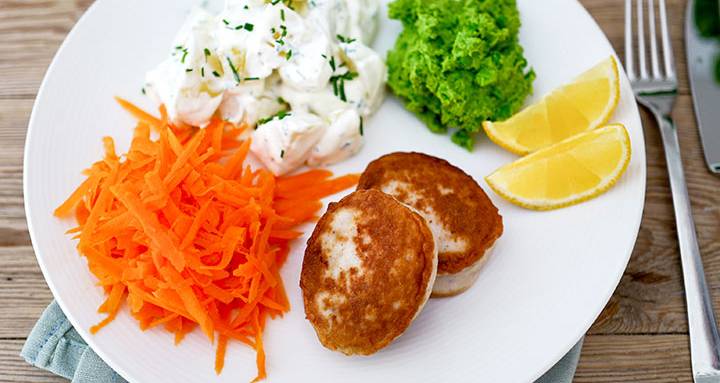Fiskekaker med kremet potetsalat og råkost | Fiskemannen