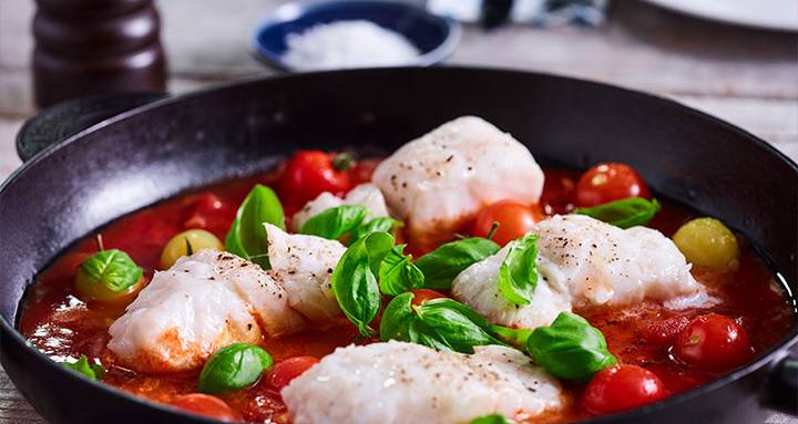 Legg i fiskestykkene og strø over vaskede cherrytomater. Legg på lokk og la det trekke på middels varme i ca 8-10 min. til fisken er klar.