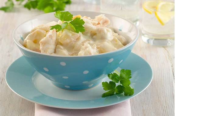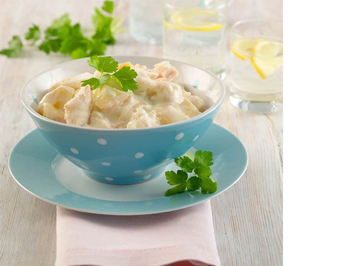 Tin fisken i kjøleskapet over natten. Trekk i saltet vann eller bruk rester av fisk fra en tidligere middag. Smelt smør i en kasserolle og ha i melet. Trekk kjelen til side, ha i halvparten av melken og visp sausen glatt. Kok opp under omrøring. Ha i resten av melken og kok i ca 10 min. Smak til med salt og pepper. Ha i poteter som er delt i terninger og "plukk" fisken i biter. Varm til alt er gjennomvarmt. Skrell og riv gulrøttene. Legg litt smør på hver porsjon plukkfisk rett før servering. Kan serveres med flatbrød.