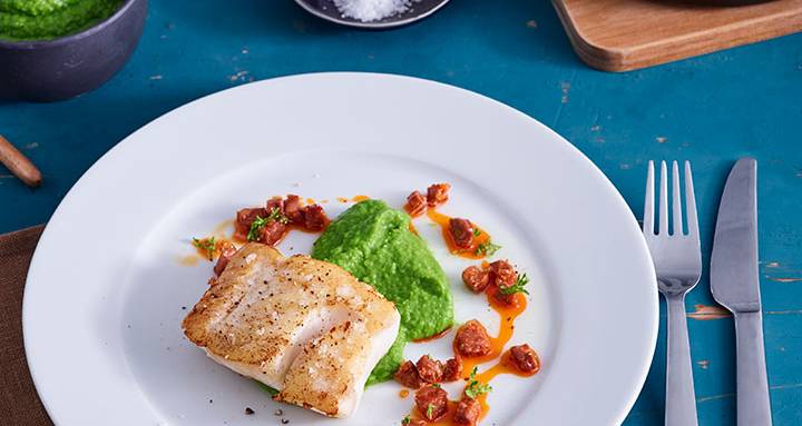 Skjær torsken i biter og stek i stekepanne i olivenolje på middels varme i ca 3 min. på hver side. Kok opp ertene, hell av vannet, men ta vare på litt. Kjør ertene til en glatt røre med stavmikser og spe med vannet til ønsket konsistens. Smak til med salt, pepper og litt sitronsaft.
