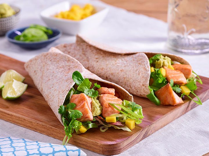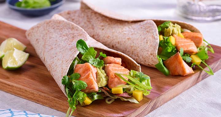 Skrell mangoen og skjær i små terninger, vask salaten. Smør kremost på lefsene og fyll med grønnsaker og laks. Topp med avokadokrem, koriander og finhakket vårløk.
