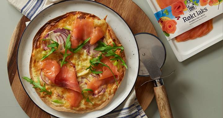 Smør crème fraîche på tortillalefse, og strø over revet ost. Fordel rødløk over pizzaen og stek pizzaen på 225 g til osten er gylden. Topp med røkt laks og ruccola og server!