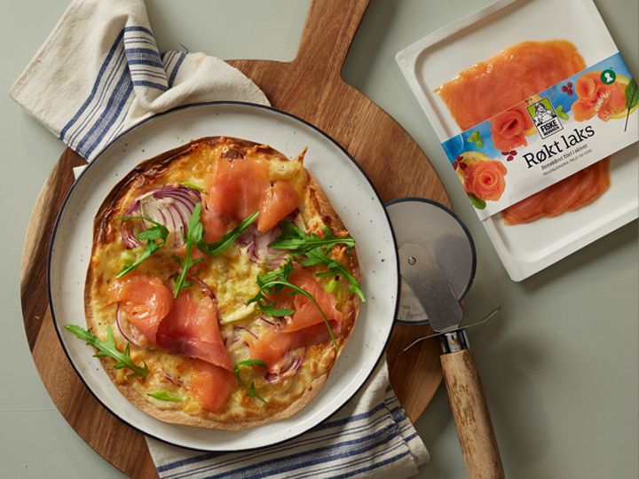 Smør crème fraîche på tortillalefse, og strø over revet ost. Fordel rødløk over pizzaen og stek pizzaen på 225 g til osten er gylden. Topp med røkt laks og ruccola og server!