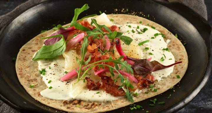 Her er inspirasjon til en skikkelig god julelefse med kald lutefisk, rømme, bacon og syltet rødløk.