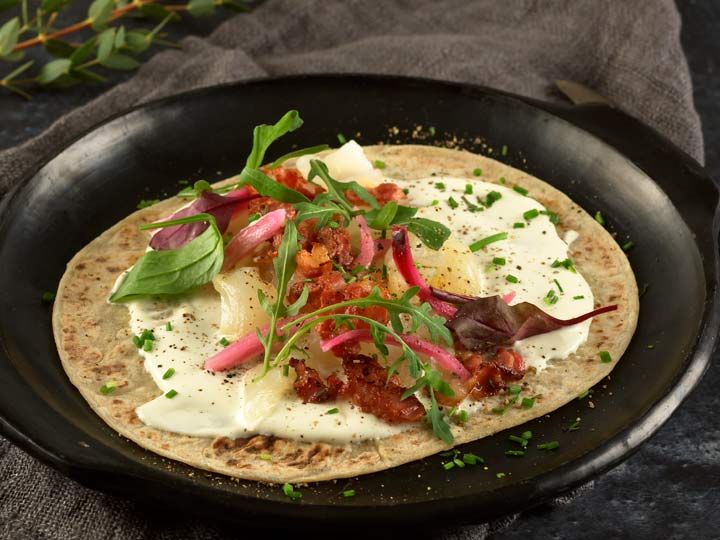 Her er inspirasjon til en skikkelig god julelefse med kald lutefisk, rømme, bacon og syltet rødløk.