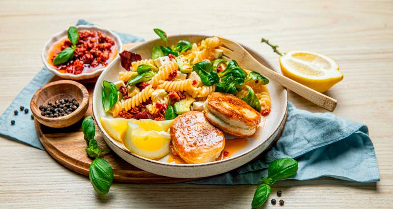 Pastasalat og fiskekaker smaker like godt til middag som til lunsj, og kan varieres med den type pasta og grønnsaker du liker best. Her er det bare fantasien som setter grenser. Oppskrift på en smakfull variant med soltørket tomat, fetost og avokado finner du her.