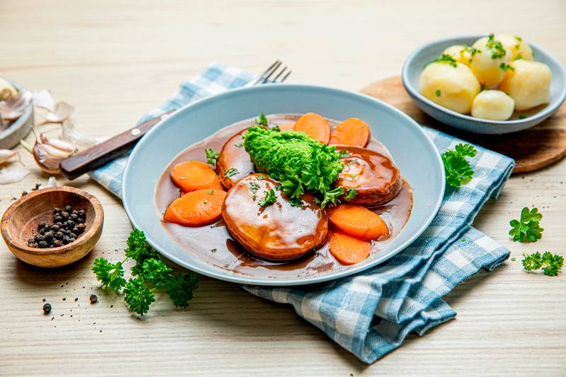 Med denne retten får du friske farger og god smak på tallerkenen, du lager enkelt både potetsalat og ertepuré selv. Se fremgangsmåte for dette her.