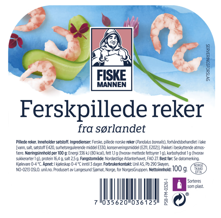 Reker (Pandalus Borealis), forhåndsbehandlet i lake [vann, salt, søtstoff E420, surhetsregulerende middel E330, konserveringsmiddel (E211, E202)].